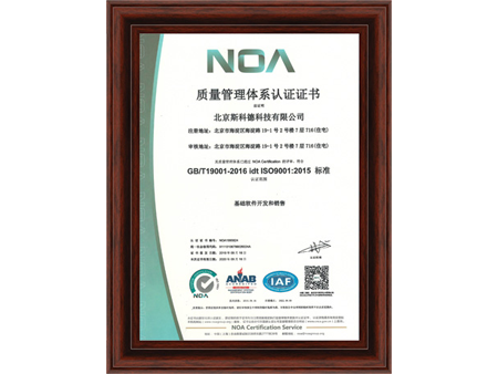 北京斯科德科技有限公司质量管理体系通过NOA Certification的评审,符合GB/T19001-2016 idt ISO9001:2015标准;认证范围:基础软件开发和销售