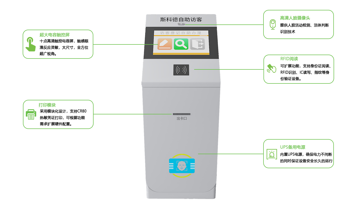 斯科德立式自助访客服务终端,是一种集成了多种功能的设备,主要用于企业大厦、企事业单位等场所的访客管理。这种设备通过访客信息采集终端,能够全面记录、保存来访者的证件信息、图像信息及进出信息,并提供便捷的多方式查询功能。立式自助访客一体机通常设置在大厅的人行入口处,访客可以通过自助方式进行身份登记。